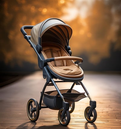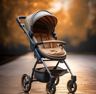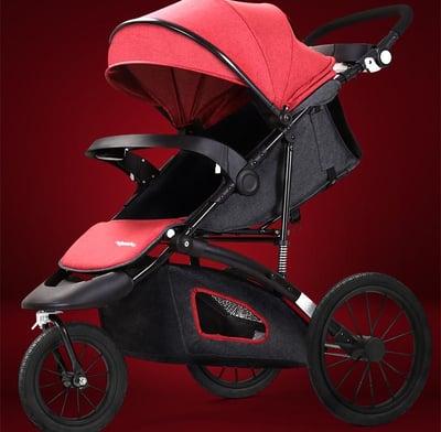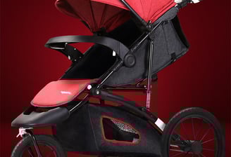 Stylish red and black stroller designed for safety and smooth rides. With easy maneuverability, a sturdy frame, and comfortable seating, it ensures a safe and enjoyable experience for both parent and baby on any terrain