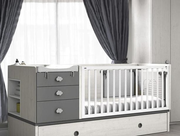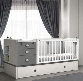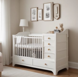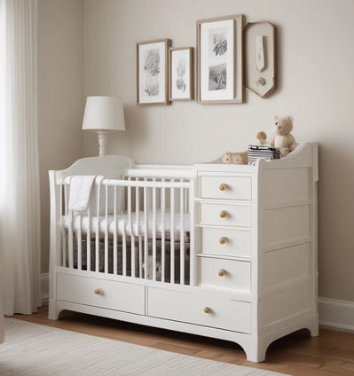 Elegant white crib made of durable engineered wood, featuring a versatile 12-in-1 storage system to keep your nursery organized. Designed for safety and comfort, this crib offers a spacious, secure sleeping area for your baby, while the integrated storage provides easy access to essentials like clothes, bedding, and toys.
